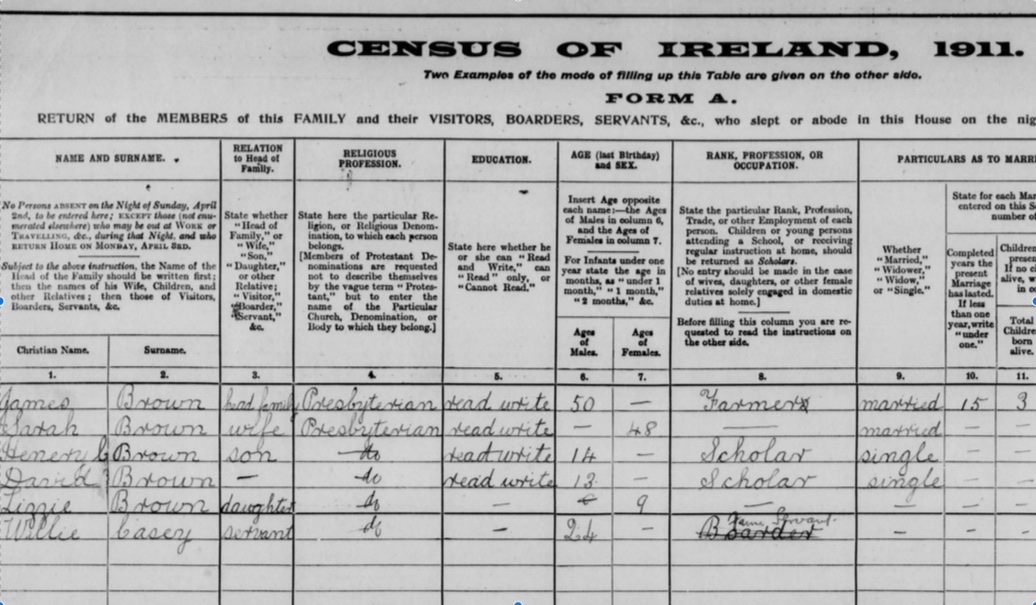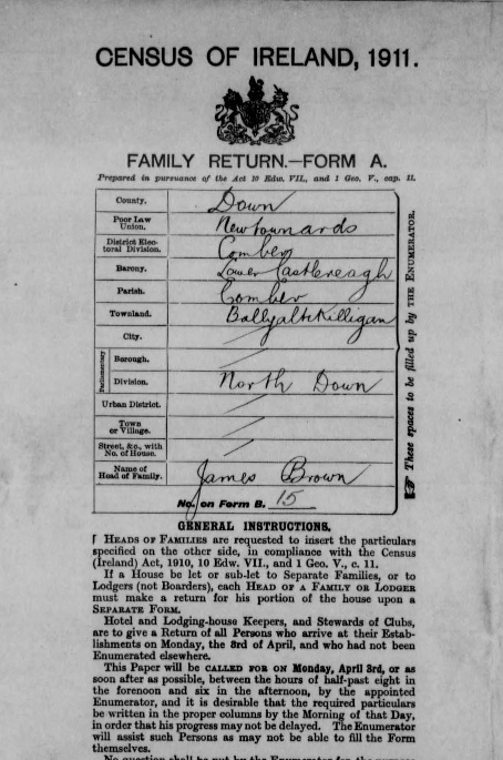 This is the townland where my paternal grandmother Elizabeth Brown was born. My great-grandfather James Brown was the “head of family” when the census was taken in 1911.
