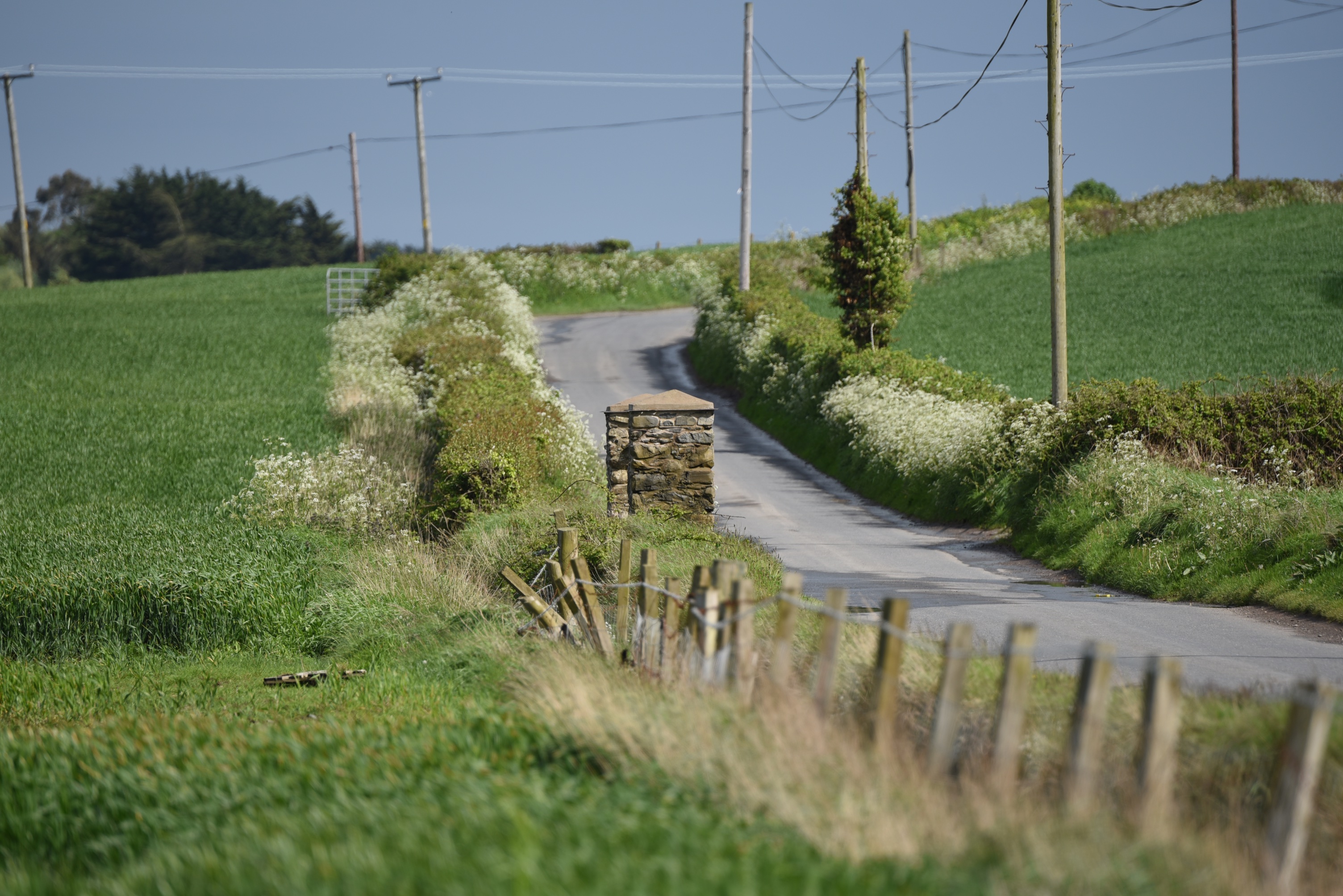 As always, I focused on the fences and gateposts. Over the hill in this picture, the road winds on and down to the causeway connecting the mainland with Reagh Island and Mahee Island.