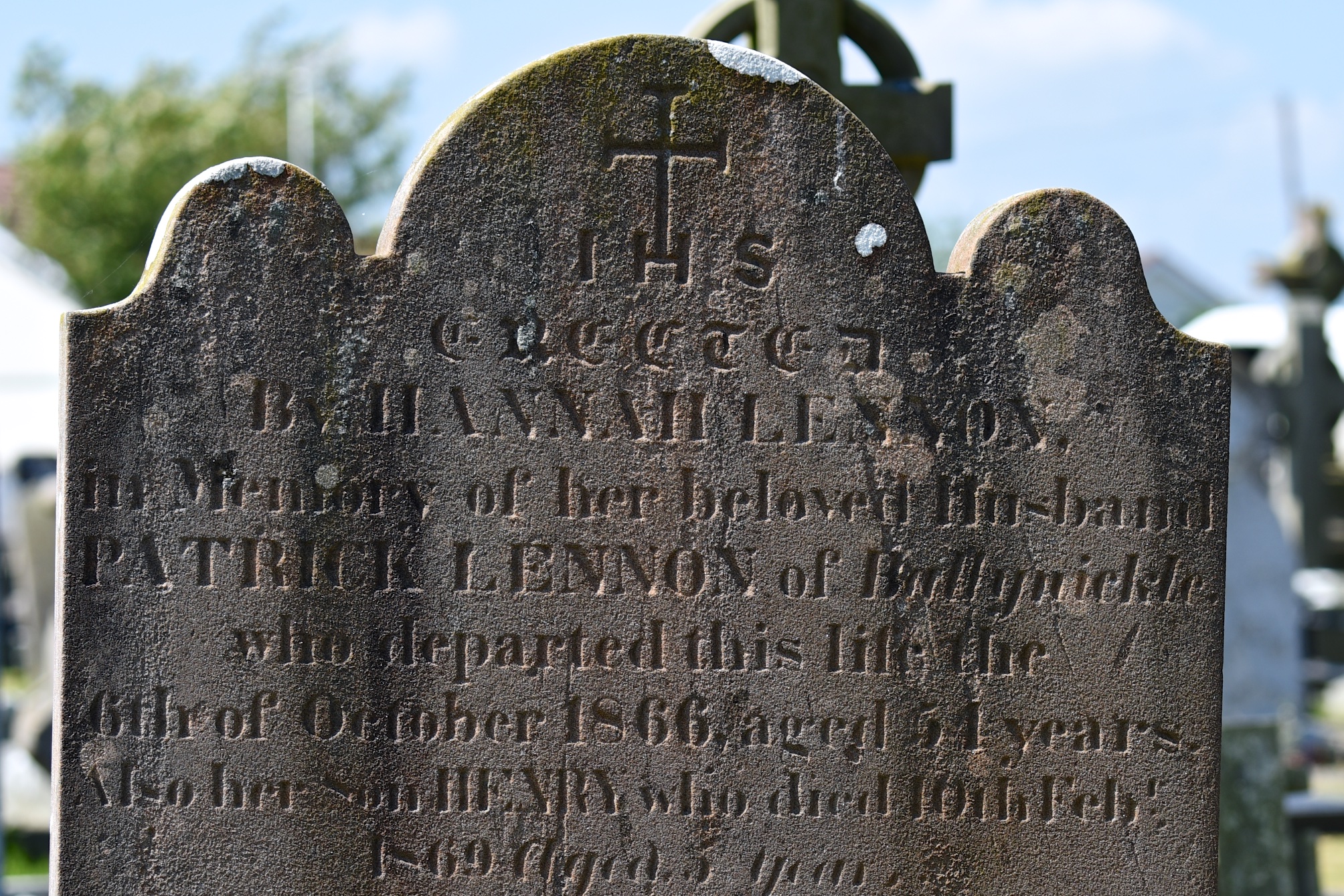 This gravestone for the Lennon family in St Patrick’s churchyard, Tullyboard, is inscribed with the spelling Ballynickle.