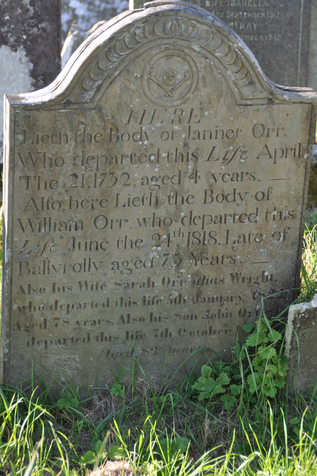 I found an old gravestone for the Orr family of Ballyrolly in the Templepatrick graveyard at Miller Hill.