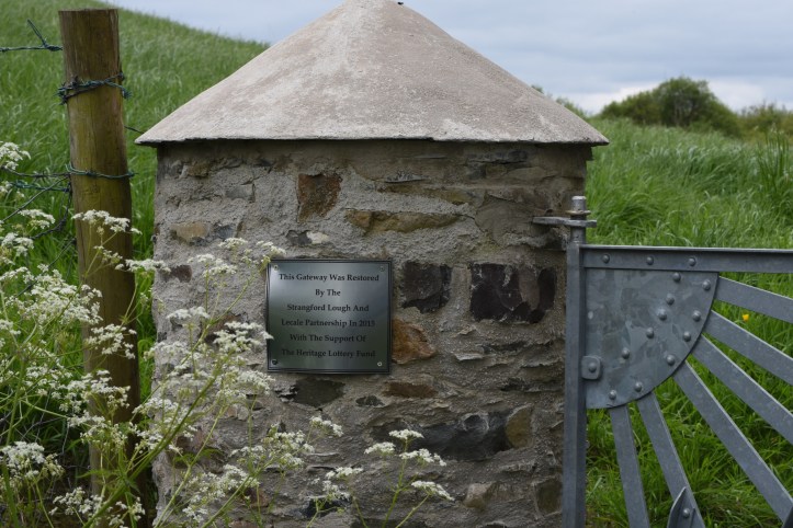 If you’ve followed this blog for a while, you’ll know that I am a fan of farm gates. At last, I find confirmation that other people consider them valuable too. The sign on this pillar in Inch says that the gateway was restored in 2015 by the Strangford Lough and Lecale Partnership with the support of the Heritage Lottery Fund.