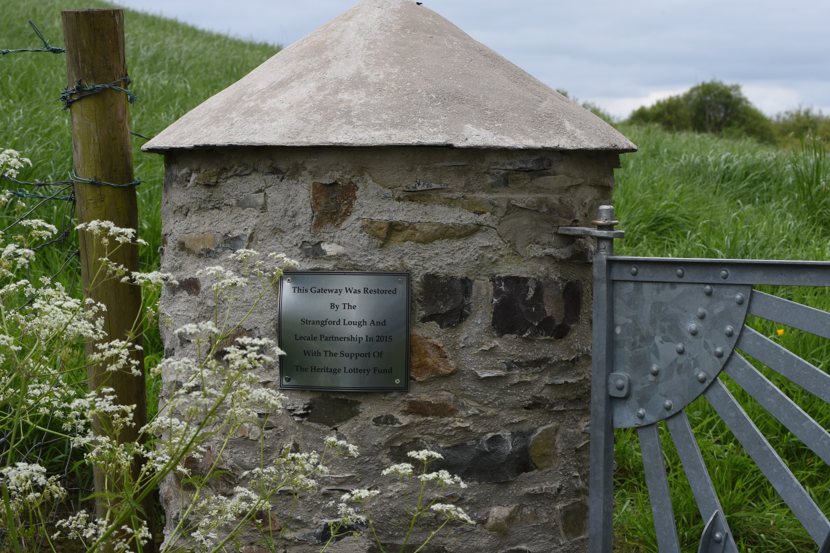 If you’ve followed this blog for a while, you’ll know that I am a fan of farm gates. At last, I find confirmation that other people consider them valuable too. The sign on this pillar in Inch says that the gateway was restored in 2015 by the Strangford Lough and Lecale Partnership with the support of the Heritage Lottery Fund.