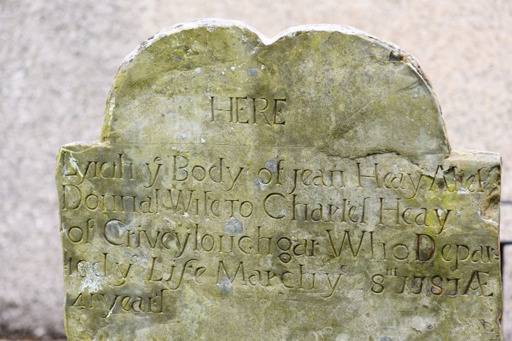 Before the Moore family arrived, where did the name Creevyloughgare come from? Well, there’s something missing from my images – a lake, which is located in the southeastern corner of the townland. According to PLACENAMESNI the early Irish name for the lake may have been Loch gCearr meaning ‘crooked lake’ or Loch Gearr meaning ‘short lough’. Either way, I haven’t managed to take a photo of the lake, just a gravestone from 1787 with an older spelling of the townland name.