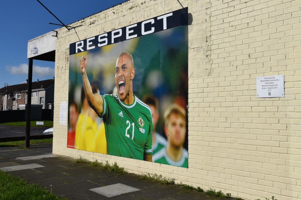 I forgive Ballyree Drive for being misplaced, because it has this joyful football mural created by Angela Ginn, showing Northern Ireland footballer Josh Magennis. Josh grew up on this estate, as was reported in the Belfast Telegraph in May 2017 and now plays for Hull City. Last week he scored for Northern Ireland against the Netherlands in a European Championship qualifying match. The team are in action again tonight, in a friendly against the Czech Republic.