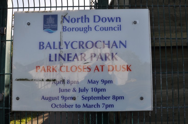 I want to mention three things here. First, the park is much more attractive than the fenced entrance suggests. Second, most of the park is in the townland of Ballymagee. And third, look at the time for dusk in June and July: 10pm: our long summer evenings are one of the best things about living here.