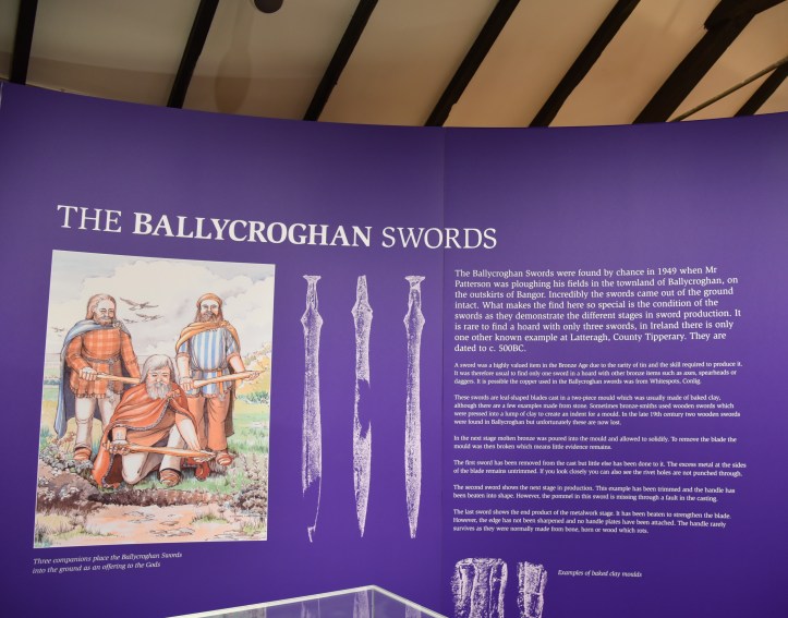 Not only is the museum the only place in Bangor where you can see Bronze Age swords, it’s the only place where you can see the official spelling of Ballycroghan with a ‘g’. All the local roads spell the townland name with a ‘c’: Ballycrochan Road being the oldest, but now joined by Ballycrochan Avenue, Drive, Crescent, Park, Gardens and Grove.