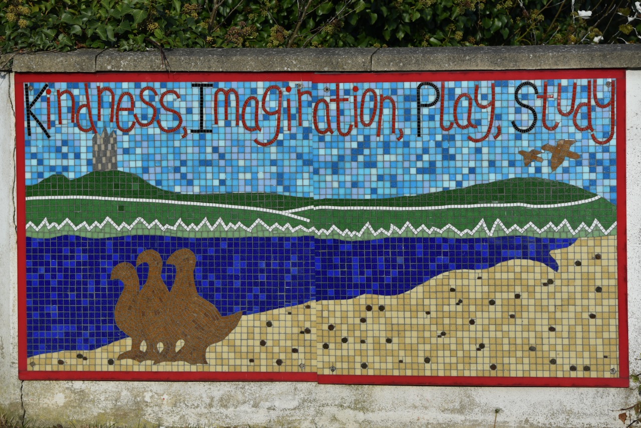 The view across to Scrabo Tower is illustrated by this mosaic outside the school gate, using the school’s initials to proclaim Kindness, Imagination, Play and Study.