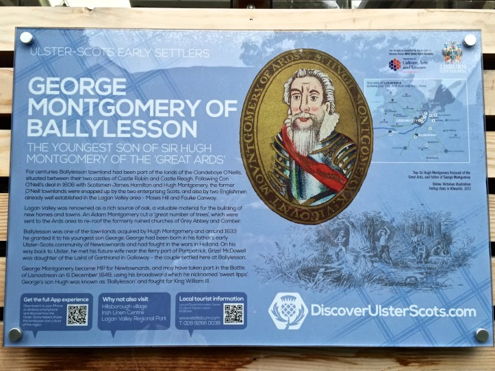 “Ballylesson was one of the townlands acquired by Hugh Montgomery, and around 1633 he granted it to his youngest son George. George had been born in his father’s early Ulster-Scots community of Newtownards and had fought in the wars in Holland. On his way back to Ulster he met his future wife near the ferry port of Portpatrick. Grizel McDowell was daughter of the Laird of Garthland in Galloway – the couple settled here at Ballylesson. George Montgomery became MP for Newtownards.”