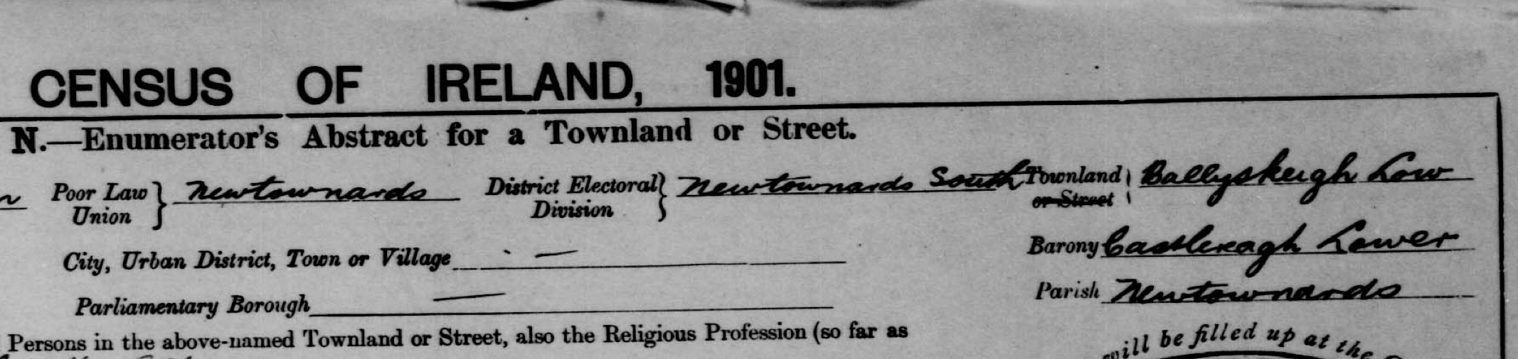 The census enumerators of 1901 and 1911 used yet another spelling: Ballyskeigh with an ‘i’. But if you are searching for your ancestors on the census website, you can still use the modern spelling of Ballyskeagh with an ‘a’.
