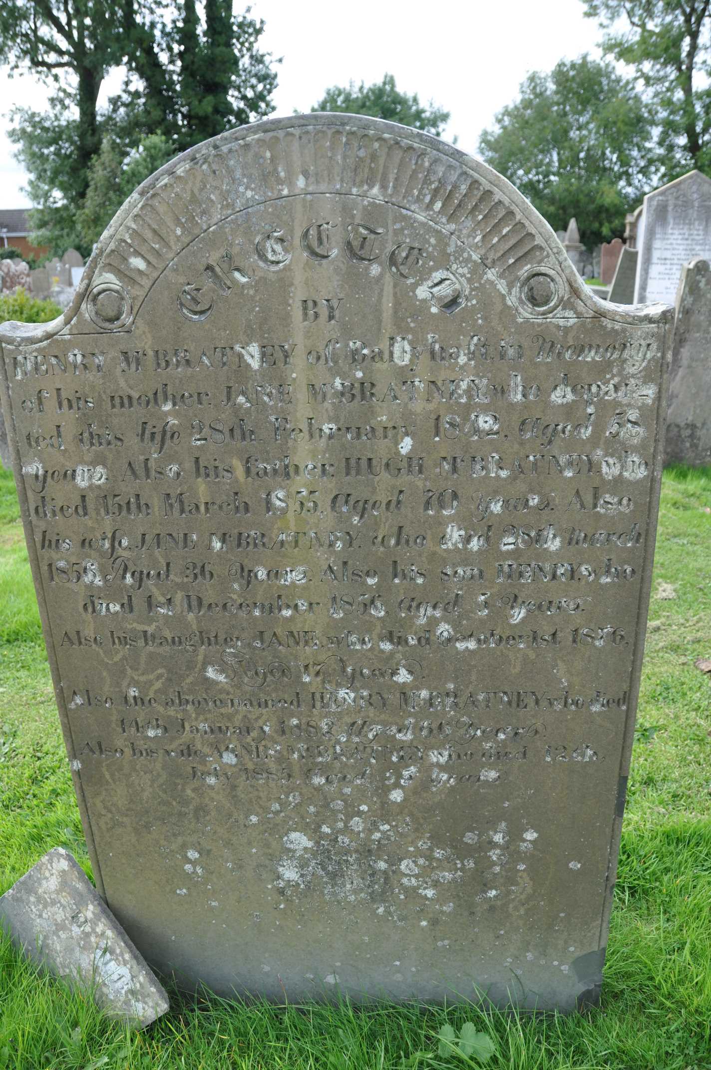 I found this headstone for the grave of the McBratney family of Ballyhaft in the cemetery at Movilla.